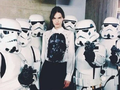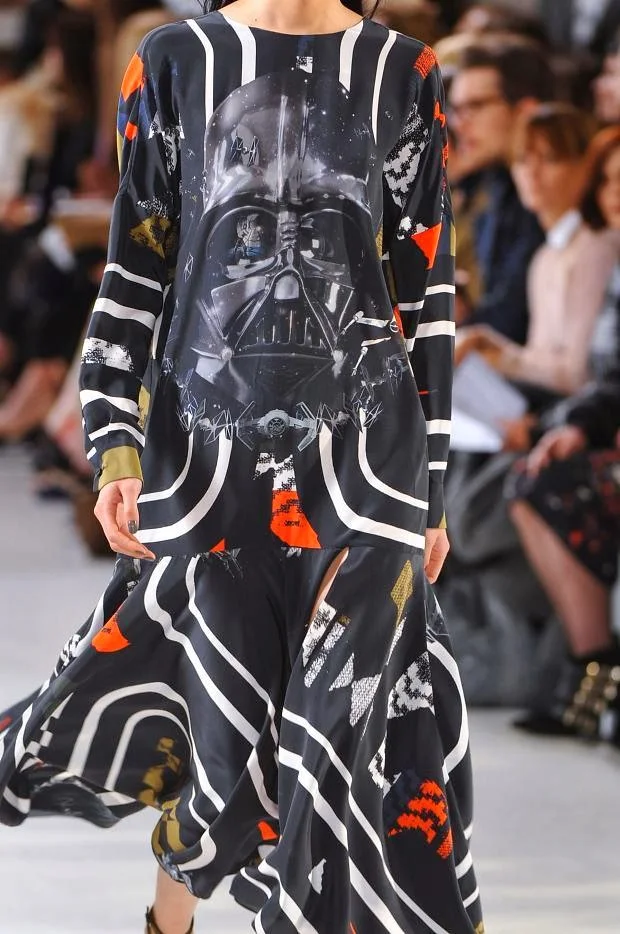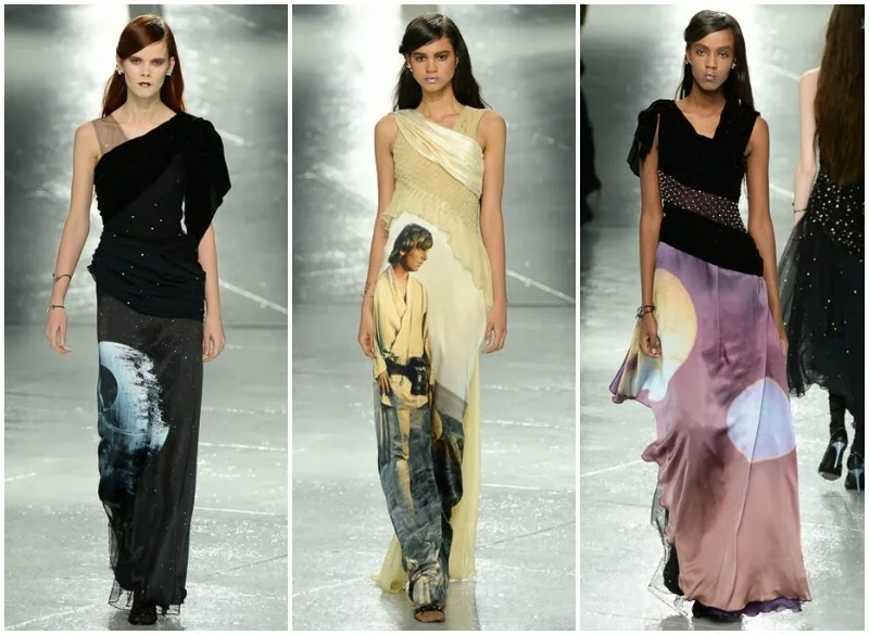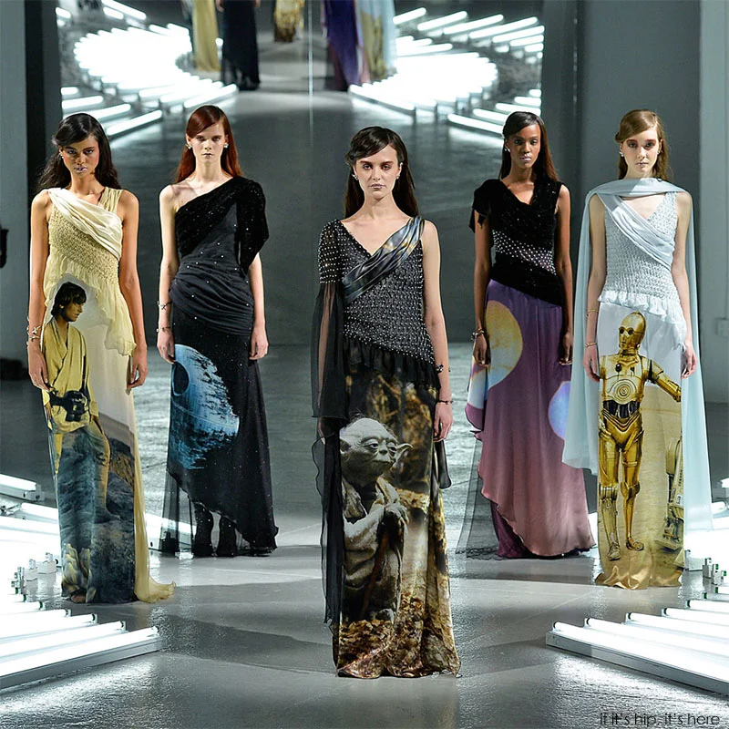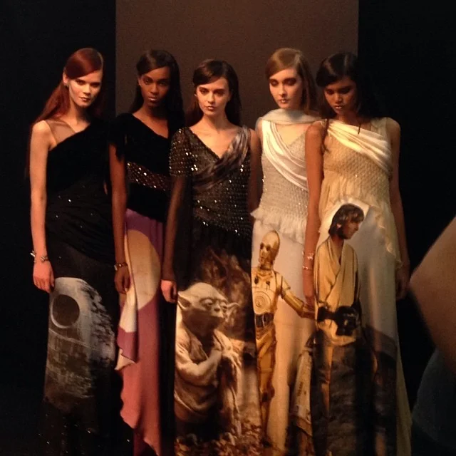 Rodarte's Fall 2014 collection featured Star Wars inspired dresses with C-3PO, Yoda and Luke Skywalker. I wonder if this is all a buzz for the new Star Wars film coming out maybe?? ;)